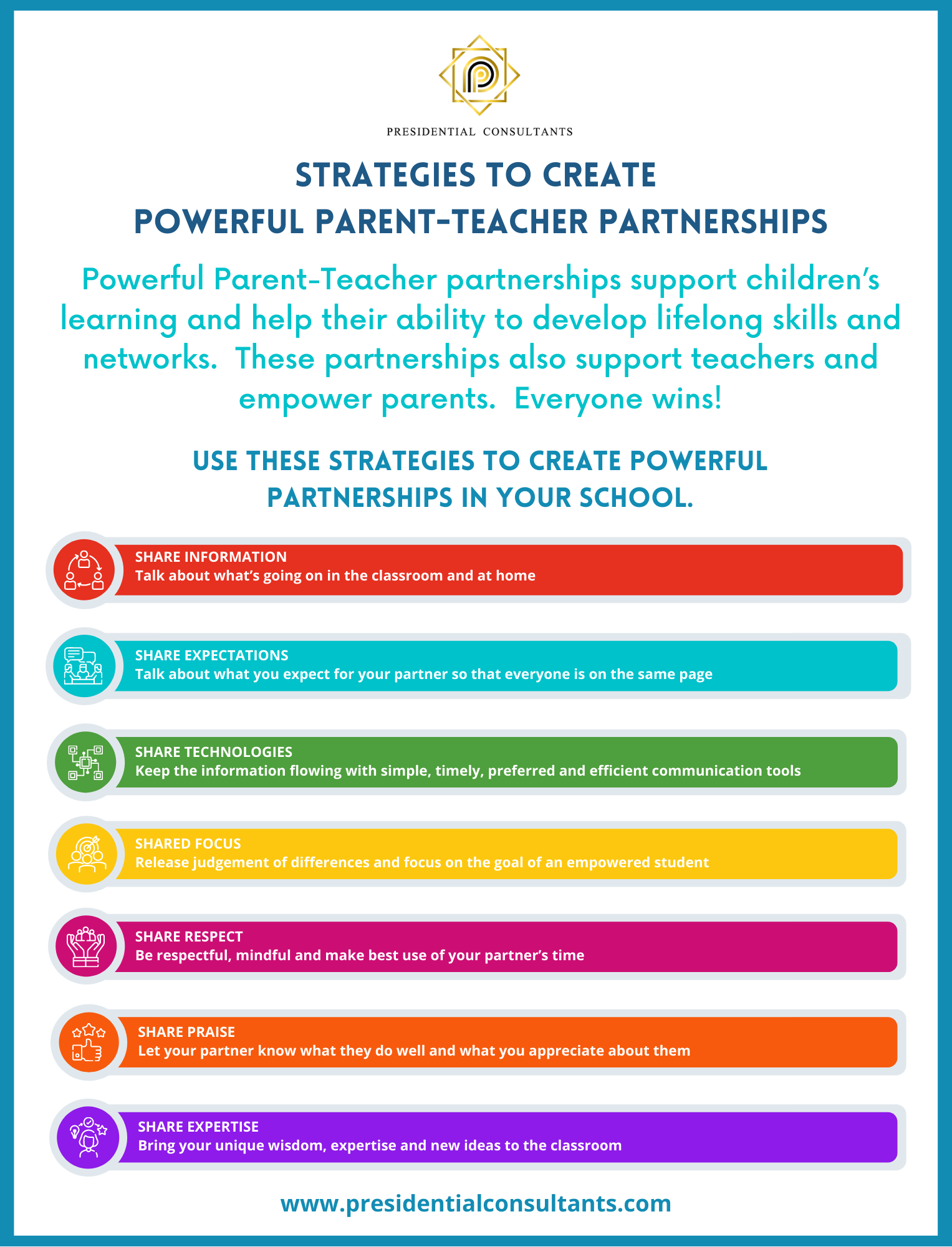 Seven strategies to build powerful parent-teacher partnerships. These partnerships support children's learning and help their ability to develop lifelong skills and networks.
